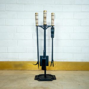 This fireplace tool set consists of a broom, a shovel, and a poker that are all hung on the stand. The poker is used to fan on the flames for longer burning duration, while the shovel and broom for cleaning the fireplace. The items are made from mild steel with wooden handles and brass accent caps. Â These tools can serve your indoor/outdoor fireplace, pizza oven or wood stove for a long time
